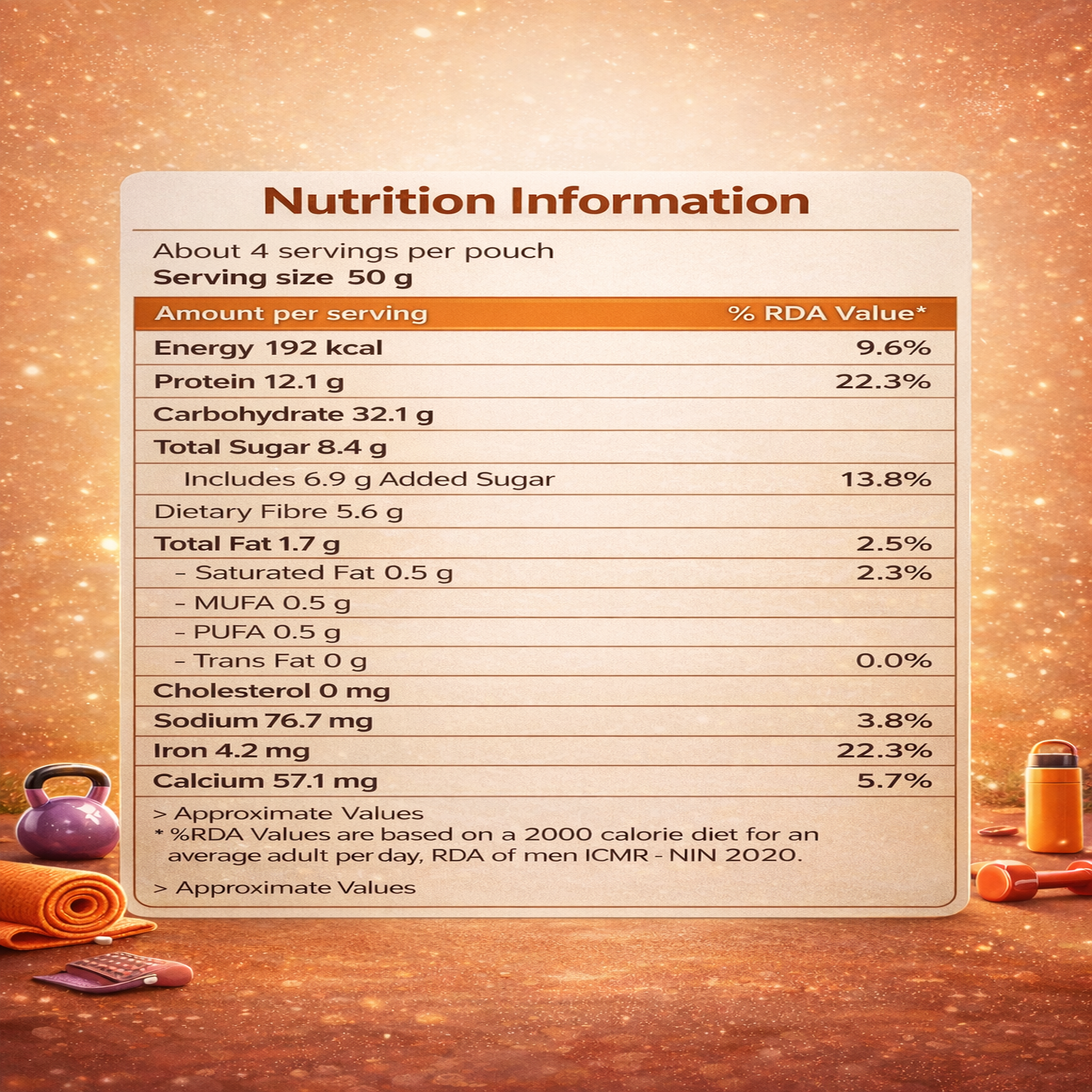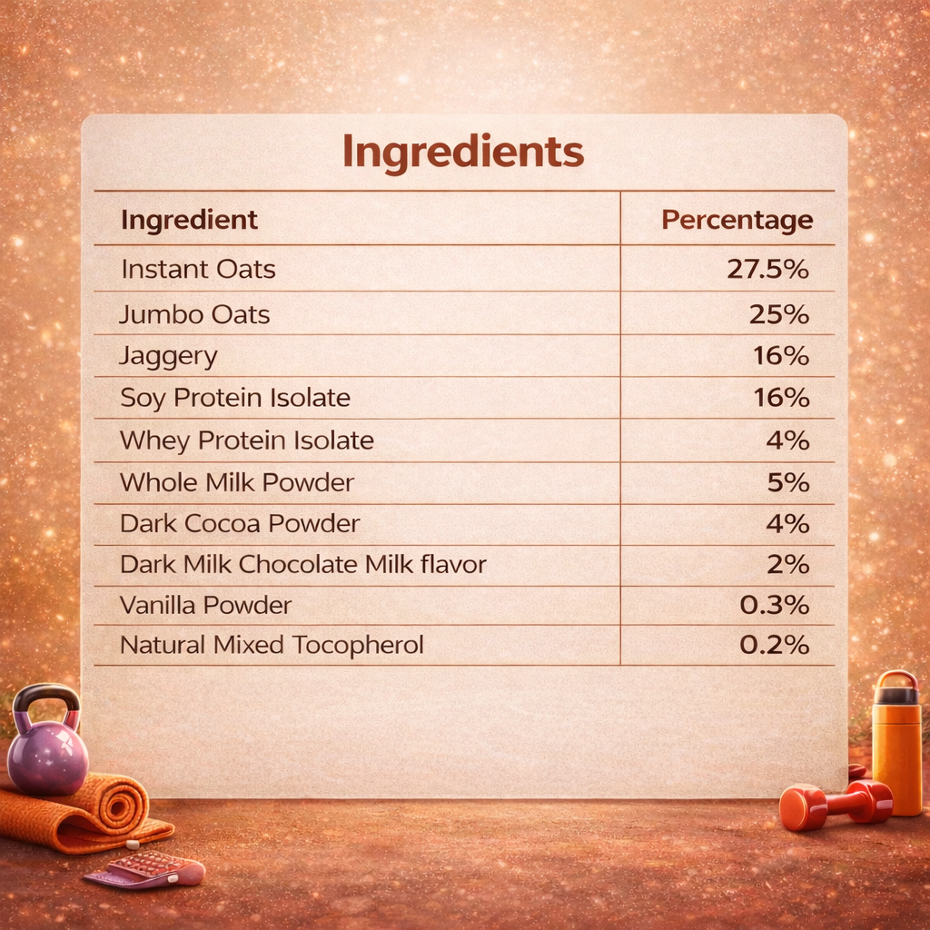 Instant Oats 27.5%, Jumbo Oats 25%, Jaggery 16%, Soy Protein Isolate 16%, Whey Protein Isolate 4%, Whole Milk Powder 5%, Dark Cocoa Powder 4%, Dark Milk Chocolate Milk flavor 2%, Vanilla Powder 0.3%, Natural Mixed Tocopherol 0.2%