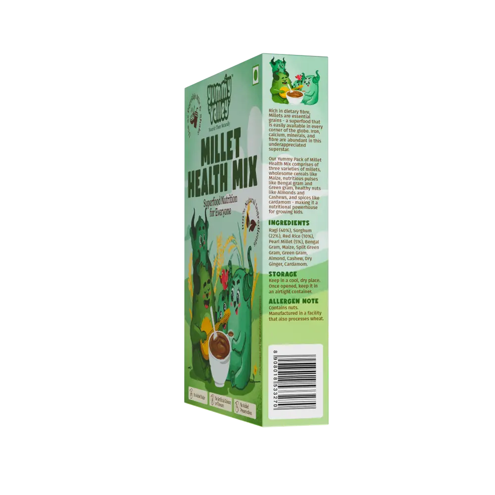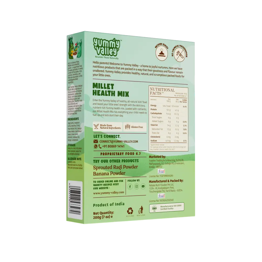 Give your toddler the nutrition of nature’s supergrains – with Yummy Valley Millet Health Mix Powder. Give your little one a healthy start with Yummy Valley Millet Health Mix Powder, a thoughtfully crafted blend of nutrient-rich millets and natural ingredients. Packed with essential amino acids, dietary fiber, vitamins, and plant-based protein, this mix is perfect for supporting growth, immunity, and energy – without compromising on taste or purity.