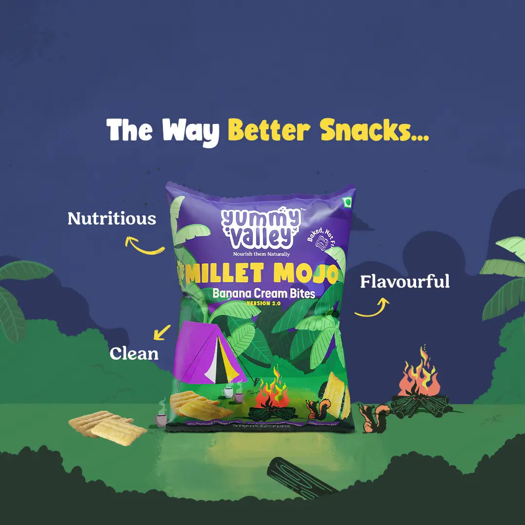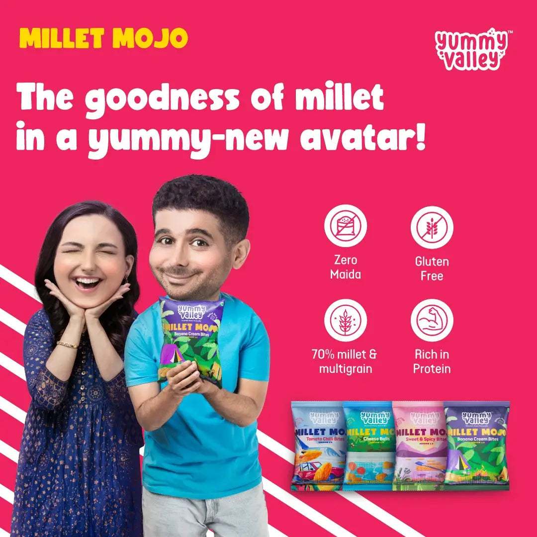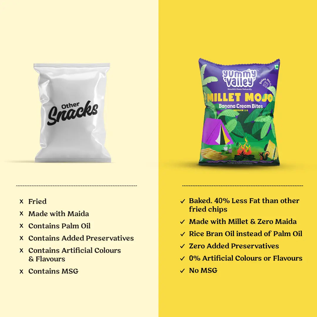 Discover the joy of snacking with Millet Mojo’s Banana Cream Bites – a perfect fusion of crunchy millet goodness and luscious banana cream . Each bite is a delightful explosion of flavour, crafted with 70% millet and wholesome multi-grains, blended with natural condiments for an unforgettable taste experience.