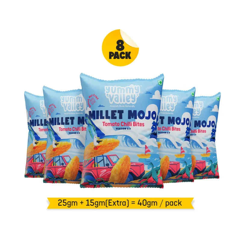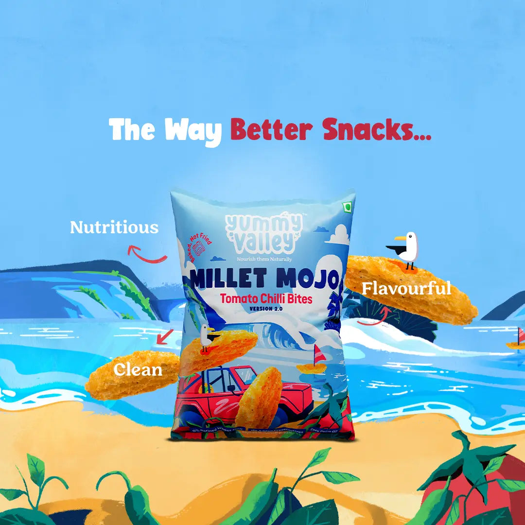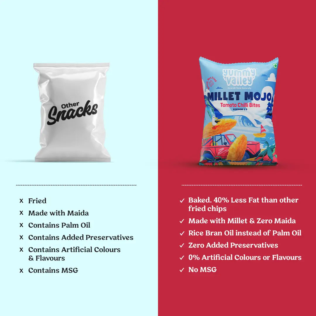 Upgrade your snack game with Millet Mojo – Tomato Chilli Bites – where flavour meets nutrition, naturally!