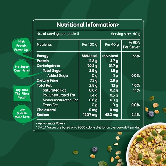 Millet (Sorghum Flakes & Nuggets) (45.5%), Brown Rice Flakes(40%), Jumbo Oats (10%), Seeds (Flax Seeds, Pumpkin Seeds) (4%), Vanilla Powder, Rosemary Extract.