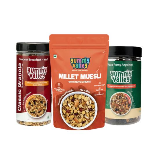 Meet the Yummy Valley Triple Crunch Treat — a thoughtfully curated bundle of our best-selling Classic Granola, Millet Muesli with Nuts & Fruits, and Nut & Seed Pizza.